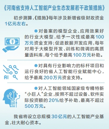 “河南是全国重要的经济大省、工业大省和人口大省,拥有海量的数据资源、丰富的应用场景、广阔的市场空间,具备在人工智能领域取得突破性发展的优势和条件。”省发展改革委有关负责人说,省委、省政府高度重视人工智能发展,提出开展“人工智能+”行动,奋力建设数智强省。为进一步强化政策供给,更好发挥财政引导与支撑作用,我省出台《措施》,贯彻落实中央决策部署,聚焦“1+2+4+N”目标任务体系,系统提出我省支持人工智能产业生态发展的政策举措。