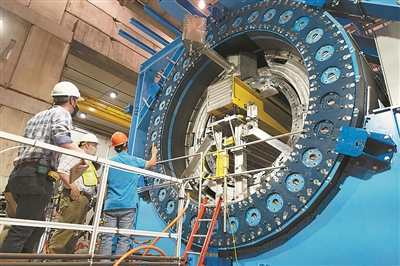 sPHENIX探测器超导螺线管磁体核心内强子量能器的安装过程。