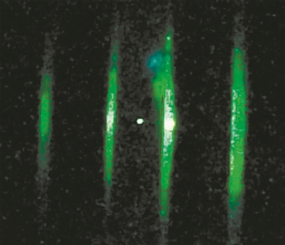 一个由玻璃制成的纳米级粒子(照片中心附近的白点)被限制在聚焦激光束产生的光势中。检测纳米级粒子散射的光,研究人员测量了其质心运动。图片来源:日本东京大学