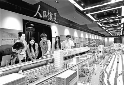 图为学校师生观看交通运输沙盘仿真模型。本报记者 洪星摄