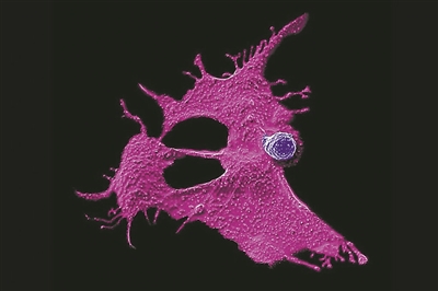 显微镜图像显示CAR-NKT细胞(蓝色)正在攻击人类实体瘤细胞(品红色)。