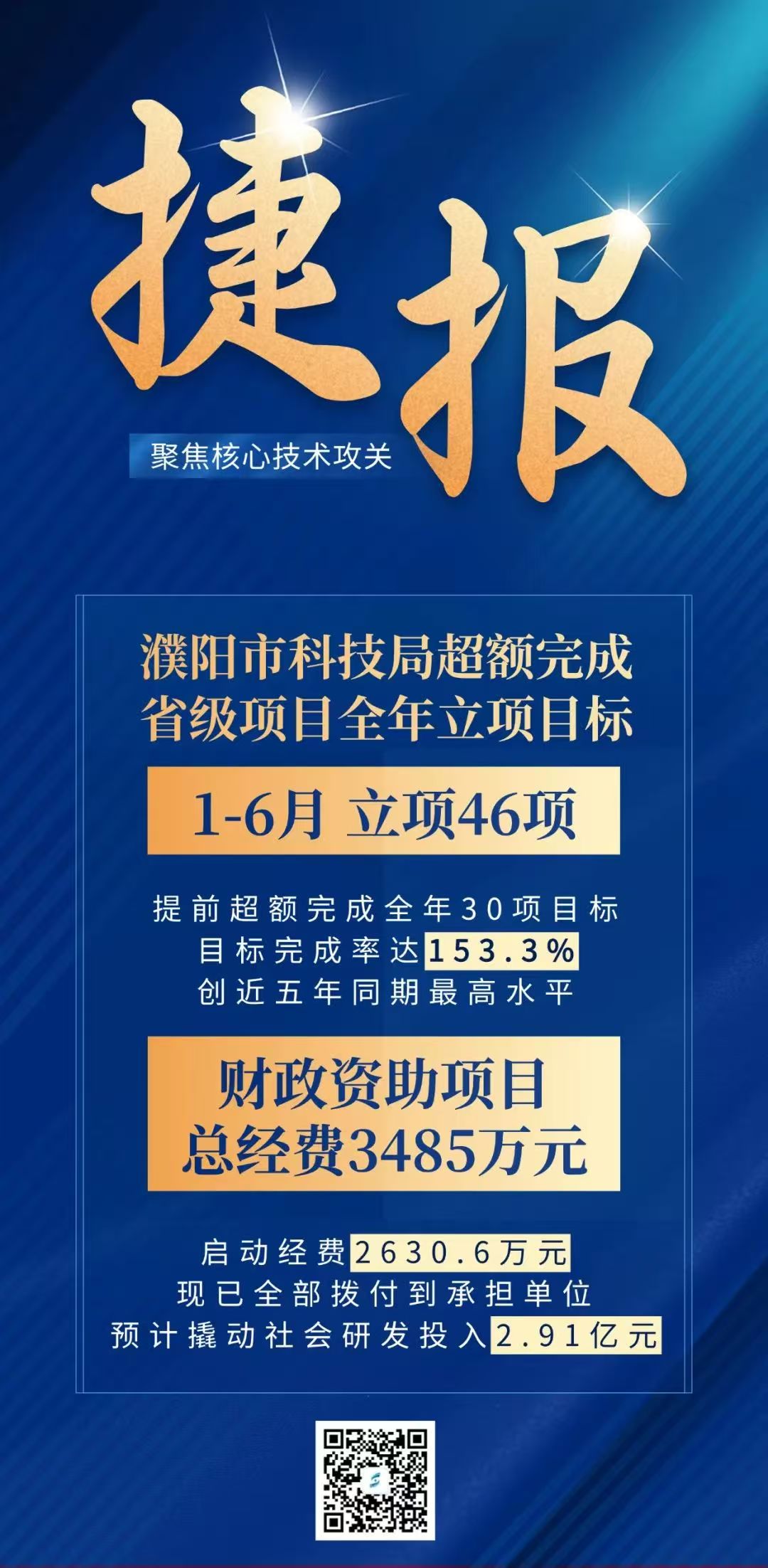 2025年,濮阳市科技局严格落实市委、市政府决策部署,深入实施创新驱动发展战略,扎实推进科技计划管理,省级科技计划项目立项工作取得突破进展。1-6月份,我市获省级科技项目立项46项,提前超额完成全年30项目标,目标完成率达153.3%,创近五年同期最高水平。