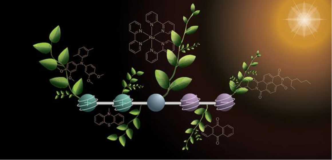 一种具有特殊结构的分子,是此次实现人工光合作用的关键一步。该分子由5个功能单元串联组成,每一部分承担特定任务。分子的一端包含两个可释放电子的单元,在失去电子后带正电;另一端有两个可接收电子的单元,获得电子后带负电;中间则是吸收光能、启动电子转移反应的核心结构。