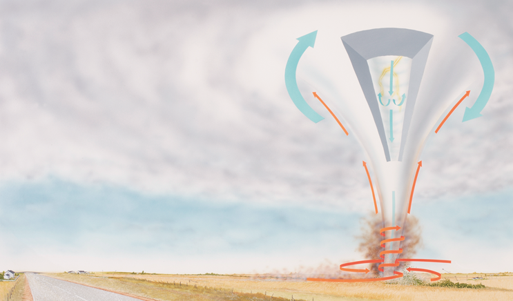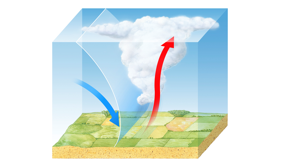 龙卷风、雷暴、飑(biāo )线都是典型的强对流。龙卷风的影响范围最小,但威力最大。垂直强对流的冷、热气流遇到水平方向的强大气流时,就会像陀螺一样旋转起来,形成龙卷风。
