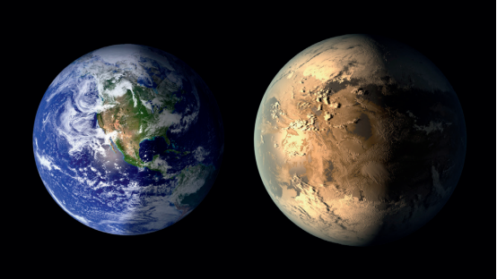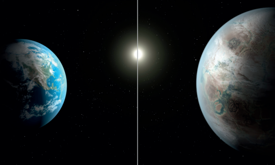 美国宇航局于201516日宣布确认发现开普勒438b,这是一颗和地球大小相近的系外行星,它距离地球470光年,直径是地球的1.12倍,表面温度约3℃,公转周期为35天,位于开普勒438这颗红矮星的宜居带内。不过这颗红矮星可能有着比太阳剧烈得多的恒星活动,以及更猛烈的耀斑和恒星风。这里或许也并不适合人类生存。图为开普勒438b(右)与地球的对比图像。