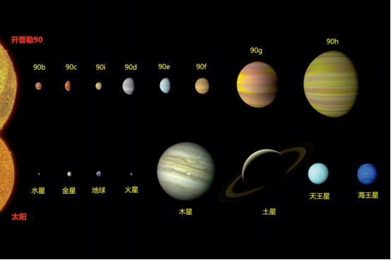 开普勒90被认为是最像太阳系的一个恒星系统,它同样有着8颗大行星,同样是固态行星距离恒星更近,气态行星距离恒星更远。开普勒90这颗恒星的质量和半径都是太阳的1.2倍,表面温度是5800℃,年龄约为20亿年。与之相比太阳的表面温度是5500℃,年龄是46亿年。开普勒90拥有6颗固态行星,只有最外侧的两颗为气态巨行星。距离恒星最近的3颗固态行星基本笼罩在恒星的光芒下,而最遥远的气态巨行星到恒星的距离只比地球至太阳稍近。不过遗憾的是没有任何一颗固态行星位于它的宜居带内。图4为开普勒90恒星系统的8颗大行星(上)与太阳系8大行星的大小对比示意图。