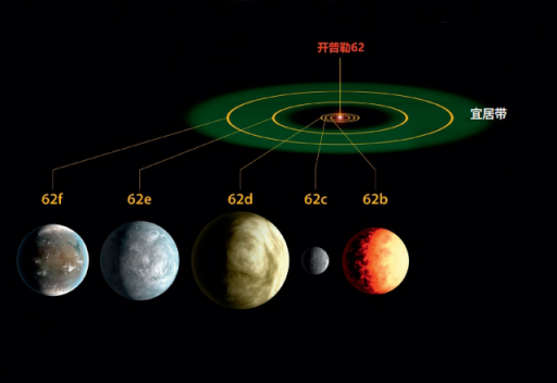 超级地球是指大小介于地球和海王星之间、表面形态并未确认是固态或气态的行星。而环绕天琴座恒星开普勒62的系外行星开普勒62f就是这样一颗超级地球,是已知距离母恒星最远的行星,它距离我们约990光年,质量是地球的2.8倍,直径是地球的1.4倍,每267天围绕它的母恒星公转一周。开普勒62f的年龄可能已经超过70亿年,根据它的年龄和辐射条件测定,天文学家认为它的表面有很大概率被海洋所覆盖,甚至还有和地球类似的季节和气候变化。图为开普勒62恒星系统示意图。
