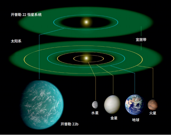 开普勒22b的直径是地球的2.4倍,而且位于宜居带内,表面温度适中,公转周期约290天。这一切似乎都与地球有很多相似之处,不过最大的遗憾在于它可能并不是一颗固态行星。图为开普勒22恒星系统与太阳系的对比示意图。