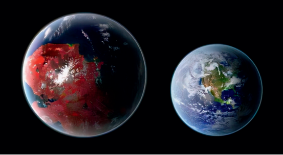 开普勒442是一颗橙色的恒星,质量约是太阳的五分之三,开普勒442b在距离其0.4天文单位的轨道上每112天公转一周。开普勒442b与开普勒438b是同一天宣布被确认发现的,其直径是地球的1.34倍,且位于宜居带内,如果进一步研究能够确认开普勒442b的大气状况,那么它极有可能成为第二个地球的候选者,不过它距离我们有1200光年,实在是太远了。图为开普勒442b(左)与地球的对比图像。