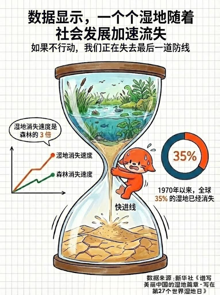据新华社等媒体报道,湿地的消失速度已达到森林消失速度的三倍。自1970年以来,全球已损失了超过三分之一的天然湿地。