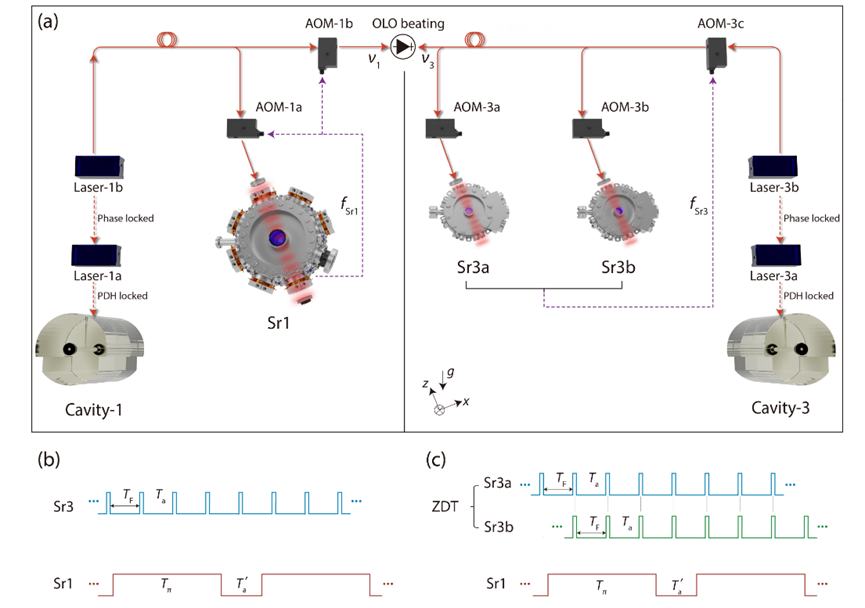 面对这一问题,中国科大团队设计了一个全新的高性能双原子系统光钟(Sr3)。这个双原子光钟内包含了两个锶原子光晶格(Sr3aSr3b),在Sr3a光钟进行原子制备的时间内,Sr3b光钟进行原子跃迁探测;而当Sr3a光钟开始进行原子跃迁探测的时候,Sr3b光钟开始进入下一轮原子制备。Sr3光钟通过交替探询两个锶原子光晶格(Sr3aSr3b),从而实现无死时间(Zero Dead Time, ZDT)光钟运行方案。