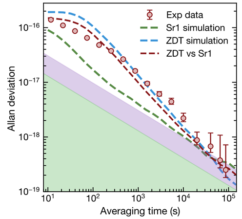 利用基于ZDTSr3光钟,中国科大团队进一步将其与稳定性优化的参考光钟(Sr1)进行比对,实现两个完全独立的光钟之间的拍频稳定度可在1~2万秒进入10?1?量级,最佳在2万秒可达2.9×10?1?,长期测量结果表明等效天稳可达2.5×10?1?,是目前报道的最好的独立光钟比对结果之一。