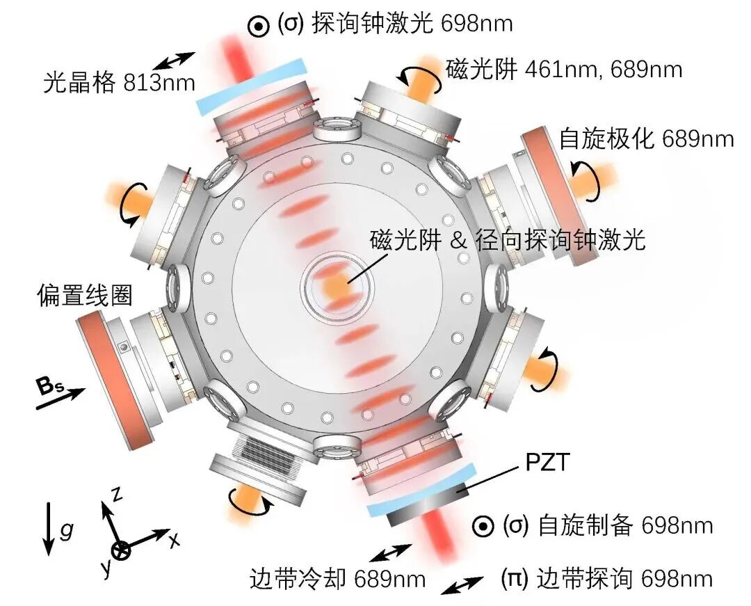 5 锶原子光钟的物理核心——原子囚禁与量子探询系统。(1)原子冷却(磁光阱):在中心的八角形超高真空腔内,激光与磁场交织构建出一座“磁光陷阱”。它能将锶原子的热运动“减速降温”,使其温度降至微开尔文。(2)原子囚禁(光晶格):竖直斜22.5度方向的激光被关在谐振腔内,通过干涉增强在空间中构建出周期性的“光势阱阵列”,如同一个由光构成的“一维格点”。冷却后的原子被囚禁在这些晶格节点中,从而消除运动带来的测量干扰。(3)精密读秒(探询):最后,极窄线宽的钟激光作为“探针”,读取这些悬浮在真空中的原子的量子振荡频率,输出超高精度的时间标准。