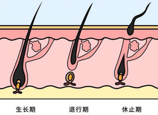结束了生长的毛发,会进入一个2-3周左右的退化期,这时的毛发就停止生长了,毛囊中的细胞也慢慢地停止工作,毛发容易脱落。退行期之后,便是静止期。