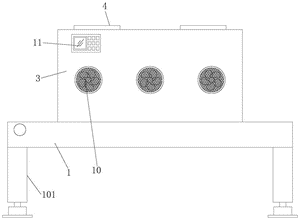本实用新型涉及冷却装置技术领域,具体为一种制备电子电器用无卤阻燃聚碳酸酯的冷却装置,包括装置主体,所述装置主体的底端四角安装有支撑底柱,所述装置主体的背面设有电源接口,所述装置主体的顶部嵌入安装有输送机构,所述装置主体的顶部罩设安装有冷却箱,所述冷却箱的内部从上至下依次设有制冷腔与冷却腔,所述冷却箱的顶部嵌入制冷腔的内部安装有鼓风风机,所述制冷腔的内壁嵌入安装有制冷板,所述冷却腔的内壁顶端四角嵌入安装有电动升降杆,所述电动升降杆的底端安装有升降风板,整体装置结构简单,方便升降出风和控温制冷的快速冷却无卤阻燃聚碳酸酯使用,且稳定性和实用性较高,具有一定的推广价值。