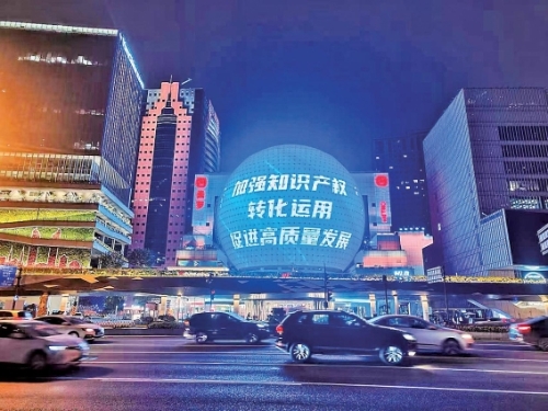 世界知识产权日,上海徐家汇等商圈地标建筑亮灯,滚动展示知识产权保护宣传标语