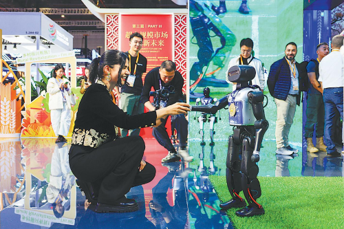 11月5日,进博会国家展中国馆内,一名伊朗参展商和机器人握手。(进博会新闻中心 供图)