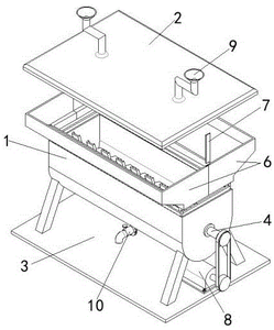 本实用新型公开了一种氮钾肥和氯化镁制备用原料混合装置,包括搅拌箱和盖板,所述搅拌箱底部设置有底座,所述搅拌箱内部贯穿有转轴,所述转轴位于所述搅拌箱的内部环形阵列有拨料板,且拨料板上开设有拨料槽,所述搅拌箱与所述盖板之间设置有挡料机构;还包括用于驱动所述转轴的驱动机构,所述挡料机构包括中间箱,且中间箱的侧壁均设置成倾斜结构。通过设置的拨料板、拨料槽和中间箱等结构,能够将原料在中间箱内部扬起并与中间箱的侧壁发生撞击,提高原料搅拌的激烈程度,同时可以将搅拌箱内发生结块的原料击碎,提高原料混合的均匀程度。